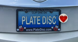 Show your love with this Red Heart Emoji Plate Disc printed in Red with a Natural background. Plate Disc is a HIPS (High Impact Polystyrene) plastic that replaces a bumper sticker or advertising magnet. Plate Discs provide a clean way to communicate your message without damaging or scratching your vehicle. Most car bumpers are no longer made of metal which will not allow magnets to be placed on the car. Plate Disc will fit most license plate frames. Show your support to your favorite charities, sports teams, schools, future honor roll students, or just whatever you believe in. Your imagination is your playground. Made in the USA!